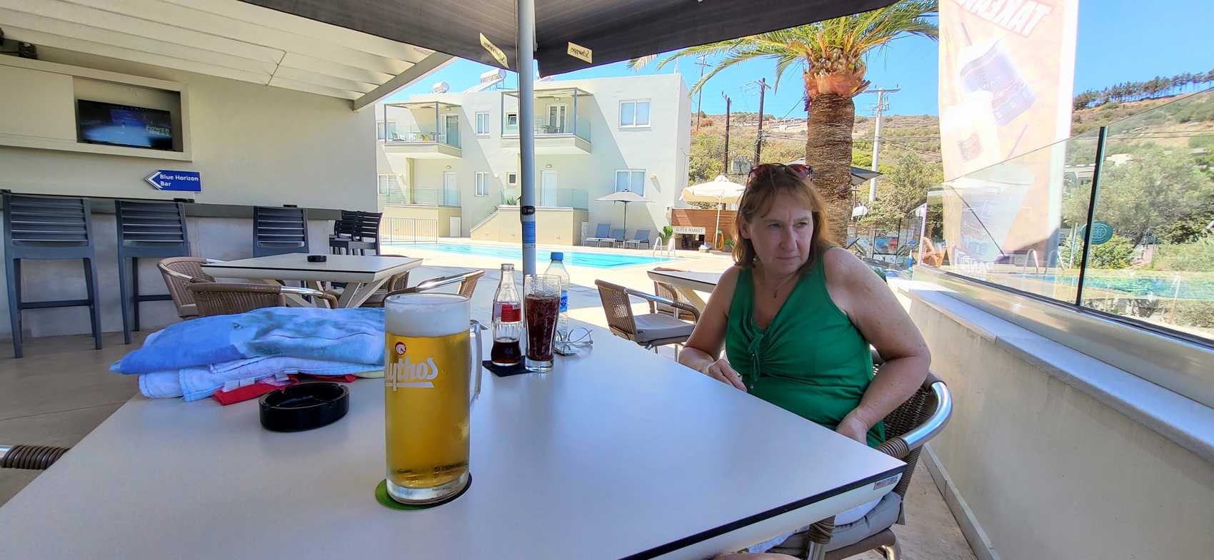 ![]() En natuurlijk begint de vakantie met een heerlijk Griekse "Mythos" bier bij ons hotel. Tevens hebben we hier meteen geluncht, want we hadden ook nog niet gegeten. Daarna zijn we lekker meteen het zwembad ingedoken. Dit soort momenten zijn altijd heerlijke momenten van het begin van de vakantie. |