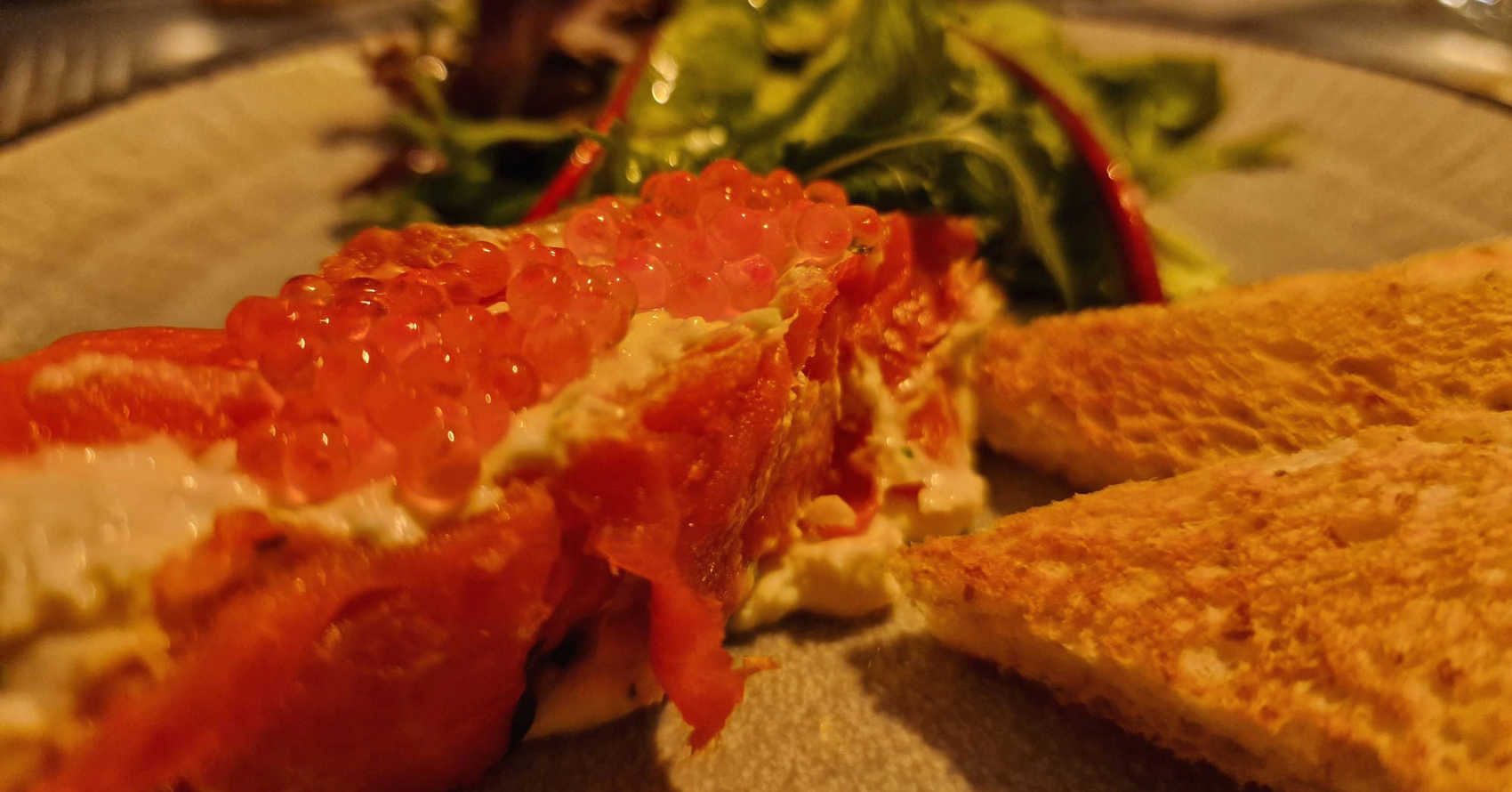 Vooraf een forelmousse met zalm en toast. Daarna een koude komkommersoep met feta kaas in filodeeg.