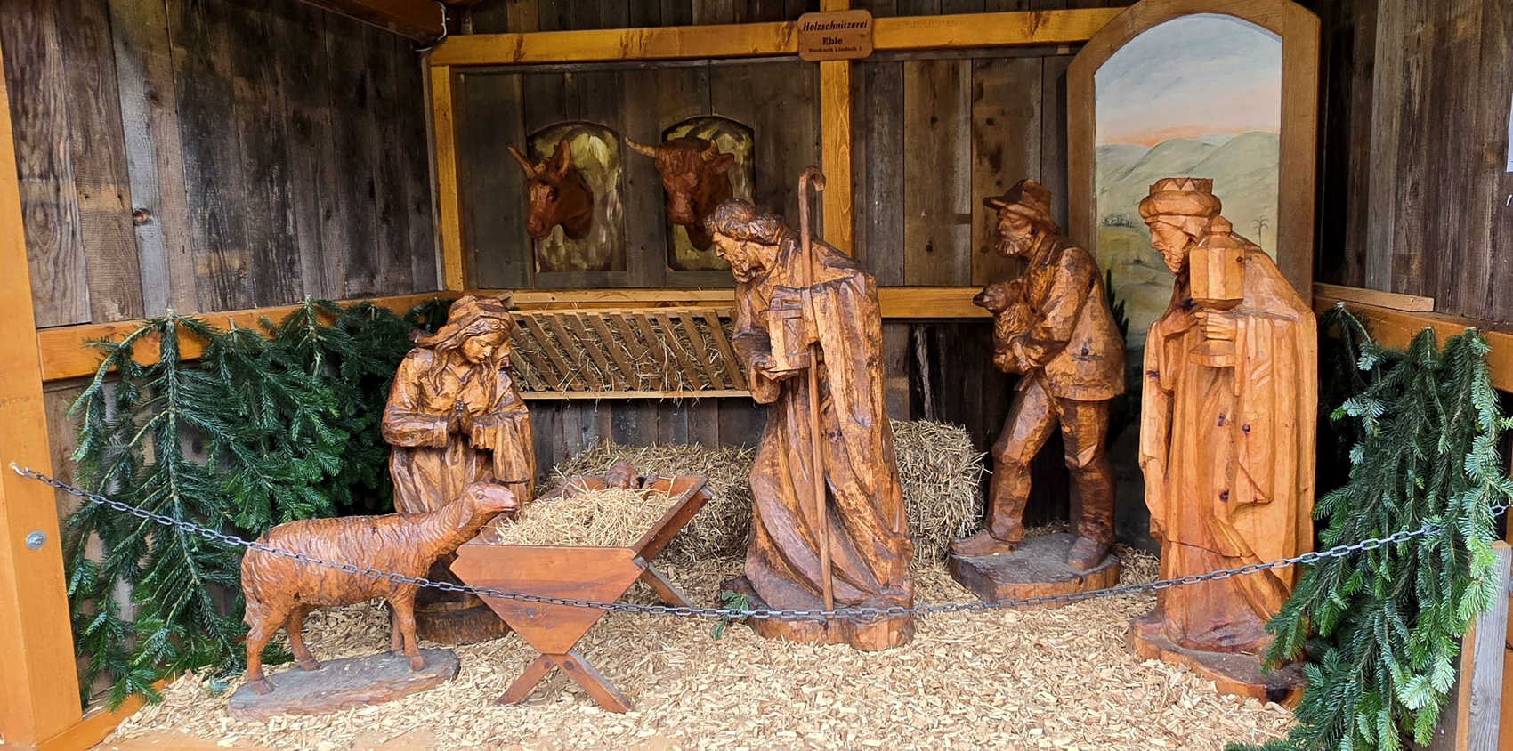 En.... een mega grote kerststal in het centrum, van mooi houtsnijwerk.